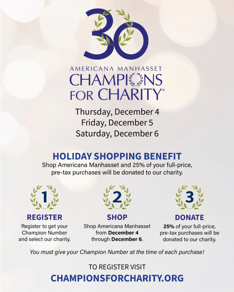 25% of percent of your full-price, pre-tax purchases at participating Americana Manhasset stores will directly support Venture House’s mental health programs, providing meals, employment pathways, community, and hope for New Yorkers living with mental health challenges.