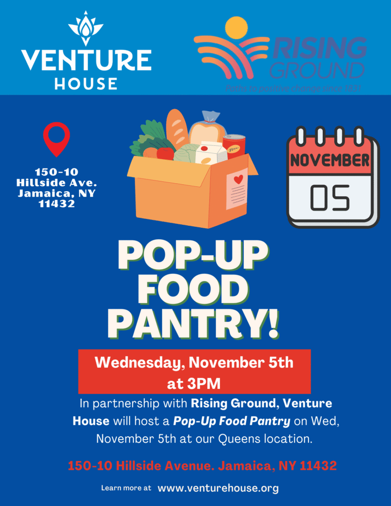 In partnership with Rising Ground, Venture House will host a Pop-Up Food Pantry on Wed, November 5th at our Queens location. Location: 150-10 Hillside Avenue. Jamaica, NY 11432 Time: 3:00 PM